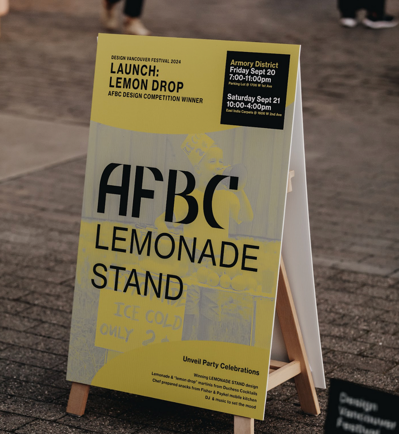 Once we officially signed on, we hit the ground running. The AFBC team had already received countless impressive submissions, and we worked closely with them to help select a winner. The brief was simple: design a lemonade stand that would serve as AFBC’s booth at the Vancouver Interior Design Show and at their launch event for Vancouver Design Week.